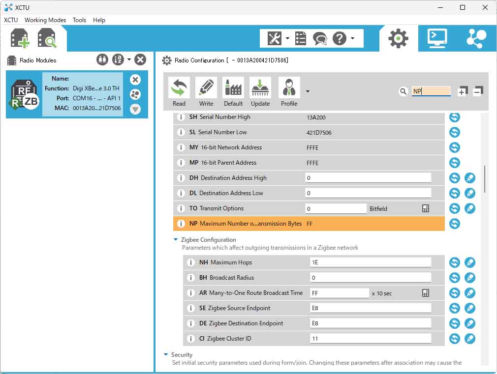 XCTUのConfigurationにおいて、NP(Maximum Number of Transmission Bytes)パラメータを確認することができます。このパラメータはRead Onlyのパラメータであり、ユーザが自由に設定することはできません。NPは1回のユニキャスト送信で送信できるペイロードサイズの最大バイト数を意味します。以下に、ZigbeeファームウェアのNPが表示されているXCTUの画面を示します。