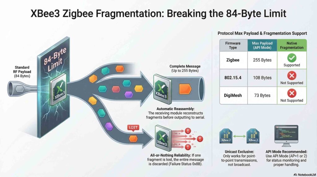 Zigbeeファームウェアでは、最大255バイトのデータを含む送信フレームを送信できます。ファームウェアはこの大きなパケットを自動的に複数のRF送信にフラグメント化します。受信デバイスは、シリアルポートにデータを出力する前に、フラグメントを再構成します。